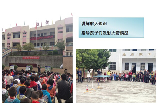 志愿者王凯为孩子们上了一堂特别的航天知识课,他从银河系讲到宇航员,从宇宙飞船引申到航天火箭,孩子们瞪大了眼睛,充满好奇地认真听着。随后,在志愿者的指导下,孩子们亲手发射了火箭模型,整个操场沸腾了。